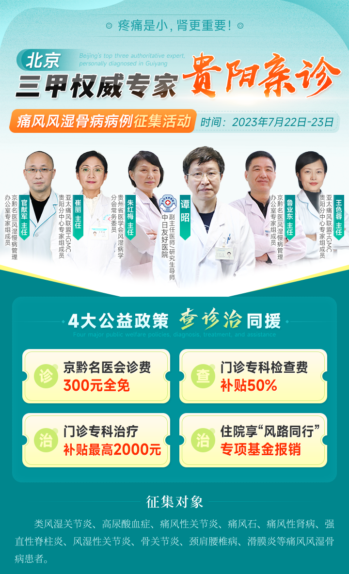 為加強(qiáng)民眾對(duì)疾病危害性的認(rèn)識(shí),幫助他們進(jìn)行科學(xué)、規(guī)范診療,7月22日-23日,<北京三甲權(quán)威專家貴陽(yáng)親診暨痛風(fēng)風(fēng)濕骨病病例征集活動(dòng)>將在國(guó)家二級(jí)貴陽(yáng)強(qiáng)直醫(yī)院?jiǎn)?dòng)!期間將為預(yù)約報(bào)名的患者提供四大費(fèi)用。