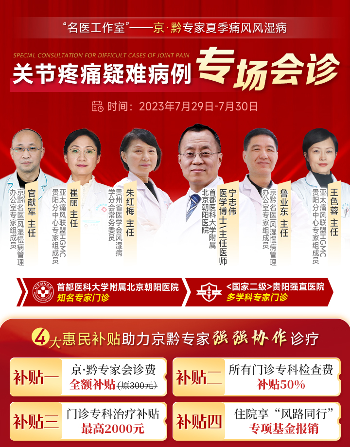 為此,國家二級貴陽強直醫(yī)院將于7月29日-30日開展“名醫(yī)工作室—京·黔專家夏季痛風風濕病關(guān)節(jié)疼痛疑難病例專場會診”活動。整合北京、貴州權(quán)威名醫(yī)資源,為廣大患者搭建方便的就醫(yī)診治平臺,開展痛風風濕關(guān)節(jié)疼痛疑難病例的聯(lián)合會診,解決廣大患者關(guān)節(jié)疼痛等疑難診療問題,滿足大家的健康需求。