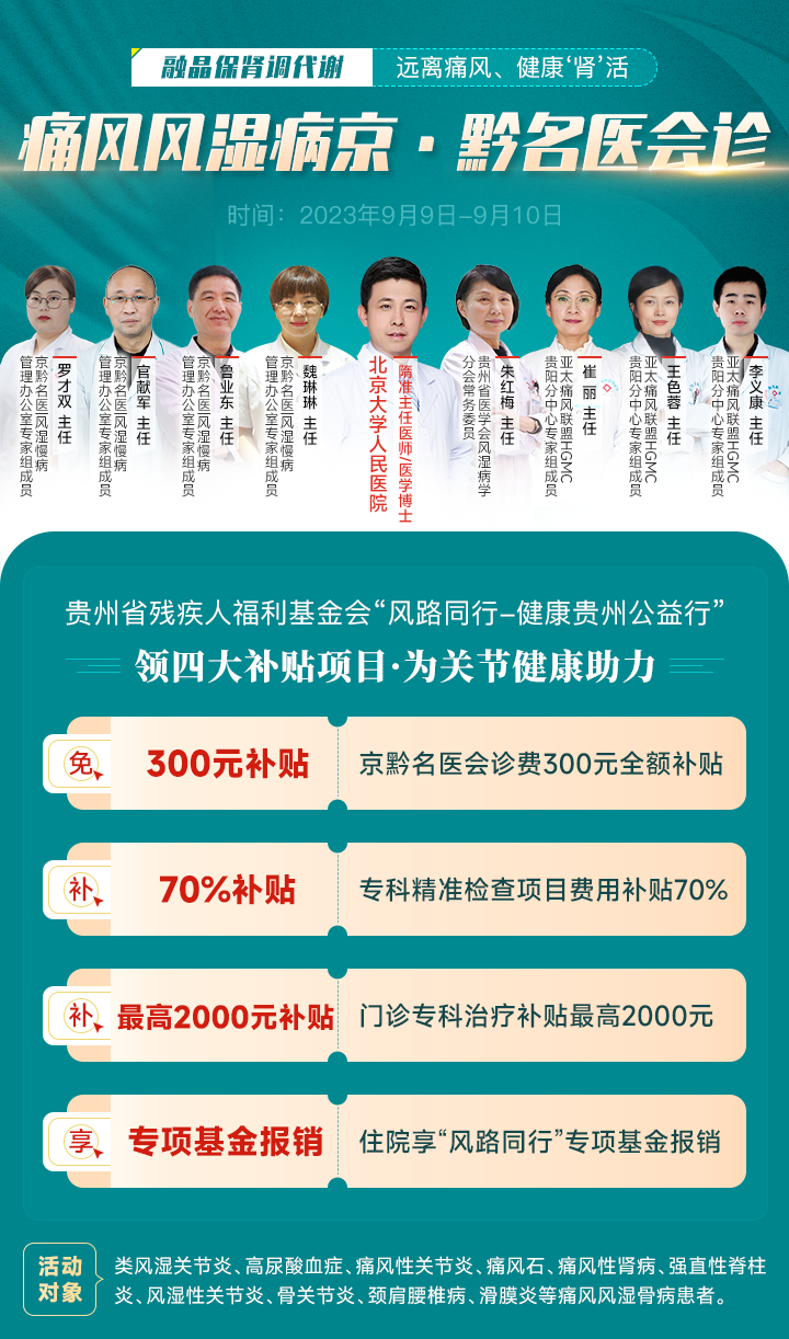 為全面普及痛風(fēng)風(fēng)濕骨病危害及科學(xué)防治知識(shí),9月9日-10日,遠(yuǎn)離痛風(fēng),健康“腎”活—痛風(fēng)風(fēng)濕骨病京黔名醫(yī)會(huì)診將在貴陽(yáng)啟動(dòng)。特邀北京大學(xué)人民醫(yī)院隋準(zhǔn)主任醫(yī)師親臨貴陽(yáng)會(huì)診,同期發(fā)放多項(xiàng)大額就醫(yī),幫助患者精準(zhǔn)治療,避免疾病帶來的健康威脅。