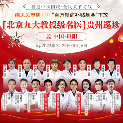 值此中秋、國慶雙節(jié)來臨之際,貴陽強直醫(yī)院將于9月29日—10月6日聯(lián)合北京中醫(yī)藥大學第六臨床醫(yī)學院、航天中心醫(yī)院、首都醫(yī)科大學附屬北京友誼醫(yī)院等北京三甲醫(yī)院舉辦“喜迎中秋國慶·全民關(guān)節(jié)防殘丨“百萬慢病基金”下放——痛風風濕病[北京九大教授級名醫(yī)]貴州巡診”活動,旨在通過京黔三甲名醫(yī)多學科聯(lián)合會診、科學的??茩z查、規(guī)范有效的治療,幫助廣大患者精準康復(fù)。