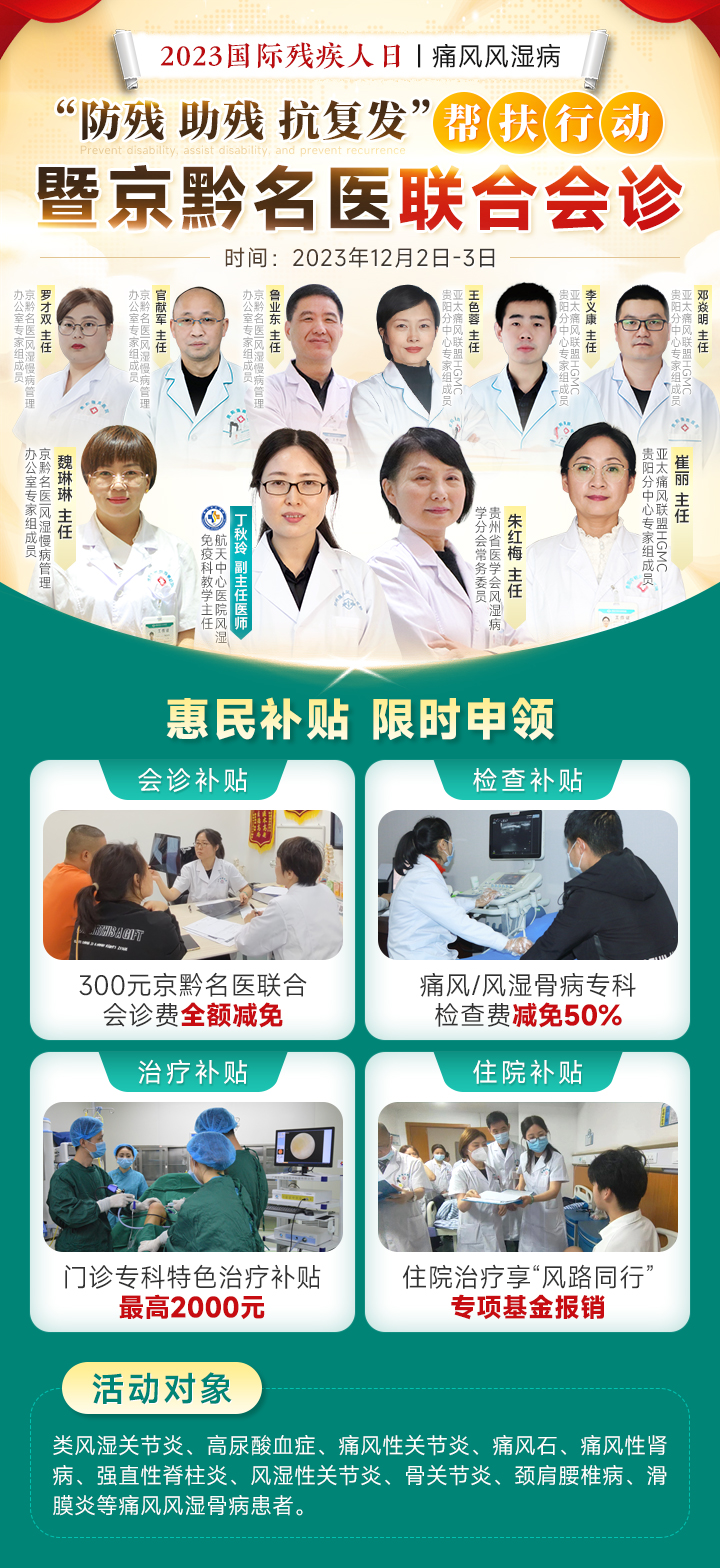 痛風(fēng)風(fēng)濕骨病“治痛防殘抗復(fù)發(fā)”,我院在行動(dòng)值此第32個(gè)國(guó)際殘疾人日到來之際,為增強(qiáng)廣大痛風(fēng)風(fēng)濕骨病患者殘疾預(yù)防意識(shí),幫助他們盡早獲得規(guī)范治療,減少關(guān)節(jié)損害、降低致殘風(fēng)險(xiǎn)。貴陽(yáng)強(qiáng)直醫(yī)院于12月2日-3日,特啟動(dòng)“2023國(guó)際殘疾人日|痛風(fēng)風(fēng)濕病‘防殘 助殘 抗復(fù)發(fā)’幫扶行動(dòng)暨京黔名醫(yī)聯(lián)合會(huì)診”活動(dòng)。