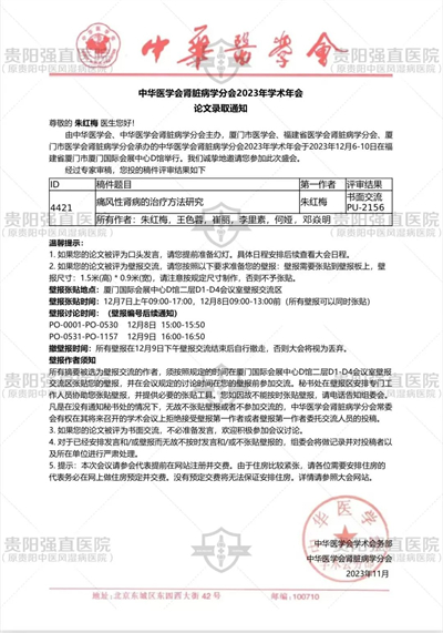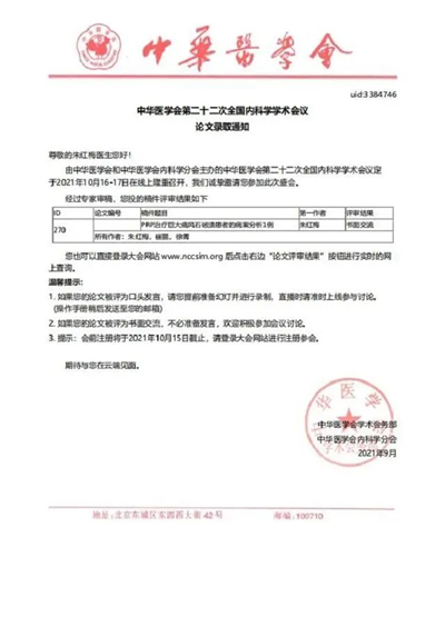 ?、僦旒t梅院長(zhǎng)發(fā)表的《PRP治療巨大痛風(fēng)石破潰患者的病案分析1例》被2021年10月16-17日在線上召開(kāi)的由中華醫(yī)學(xué)會(huì)和中華醫(yī)學(xué)會(huì)內(nèi)科學(xué)分會(huì)主辦的中華醫(yī)學(xué)會(huì)第二十二次全國(guó)內(nèi)科學(xué)學(xué)術(shù)會(huì)議錄用。
