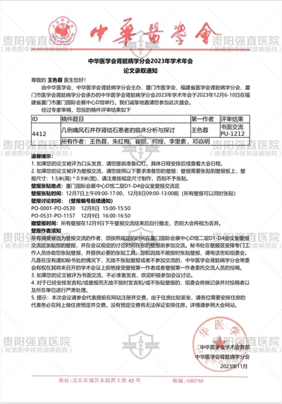 我院鄧焱明主任將參加此次會(huì)議。與此同時(shí),由我院朱紅梅主任、王色蓉主任、王色蓉主任以及李里素、何婭、鄧焱明聯(lián)合撰寫(xiě)的學(xué)術(shù)論文《痛風(fēng)性腎病的治療方法研究》和《幾例痛風(fēng)石并存腎結(jié)石患者的臨床分析與探討》雙雙被大會(huì)收錄,并以壁報(bào)的形式在本次會(huì)議進(jìn)行展示。