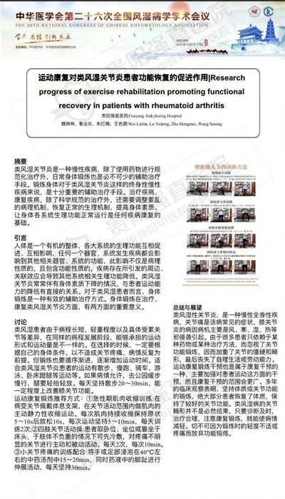 ?、谟晌以何毫樟?,魯業(yè)東,朱紅梅,王色蓉聯(lián)合撰寫(xiě)的學(xué)術(shù)論文《運(yùn)動(dòng)康復(fù)對(duì)類(lèi)風(fēng)濕關(guān)節(jié)炎患者功能恢復(fù)的促進(jìn)作用》被2023年3月29日-4月1日在陜西省西安市召開(kāi)中華醫(yī)學(xué)會(huì)第26次全國(guó)風(fēng)濕病學(xué)會(huì)議收錄。