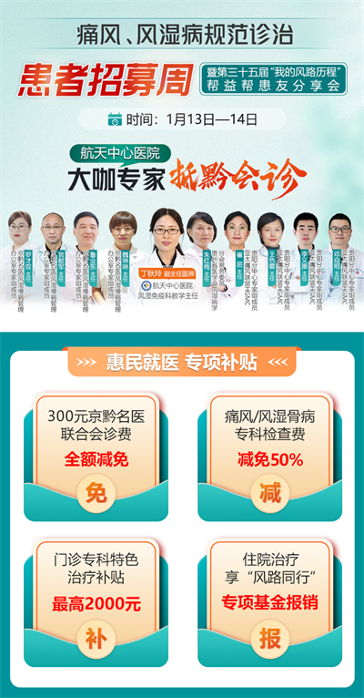 現(xiàn)面向全省公開招募關(guān)節(jié)疼痛反復(fù)、尿酸居高不下用藥療效差、活動(dòng)受限久治不愈的痛風(fēng)風(fēng)濕骨病患者。凡報(bào)名成功者,即可享北京大咖專家親診服務(wù),還可申領(lǐng)由貴州省殘疾人福利基金會(huì)支持的專項(xiàng)惠民。