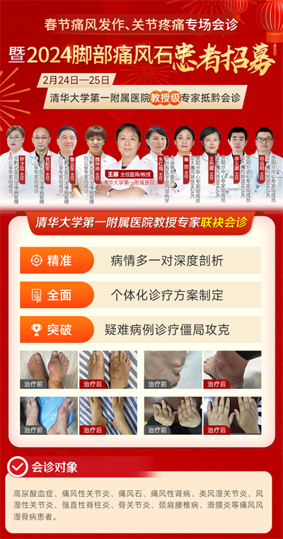 為幫助急性發(fā)病患者們盡快得到規(guī)范、系統(tǒng)的??浦委?,我院作為亞太痛風(fēng)聯(lián)盟HGMC貴陽分中心、貴州省殘疾人聯(lián)合會“風(fēng)路同行·健康貴州公益行”項目及貴州紅十字幫益幫助醫(yī)基金執(zhí)行機構(gòu),特于2月24日—25日面向全省開展“春節(jié)痛風(fēng)發(fā)作、關(guān)節(jié)疼痛專場會診暨2024腳部痛風(fēng)石患者招募”活動。