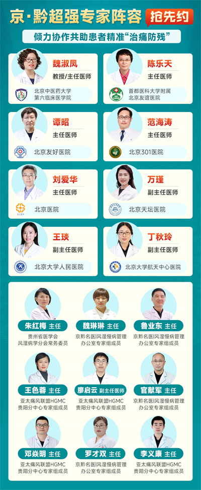 本次活動(dòng)由北京中醫(yī)藥第六臨床醫(yī)學(xué)院魏淑鳳醫(yī)生、北京友誼醫(yī)院陳樂天醫(yī)生醫(yī)師、衛(wèi)健委直屬北京友好醫(yī)院譚昭醫(yī)生醫(yī)師等北京8大名院組成的醫(yī)生組將攜手院“名醫(yī)工作室”成員,核心針對(duì)關(guān)節(jié)疼痛反復(fù)、用藥無效、尿酸難降、活動(dòng)受限等患者,共同開展“多對(duì)一”的線上線下聯(lián)動(dòng)會(huì)診,制定個(gè)體規(guī)范化診治方案。