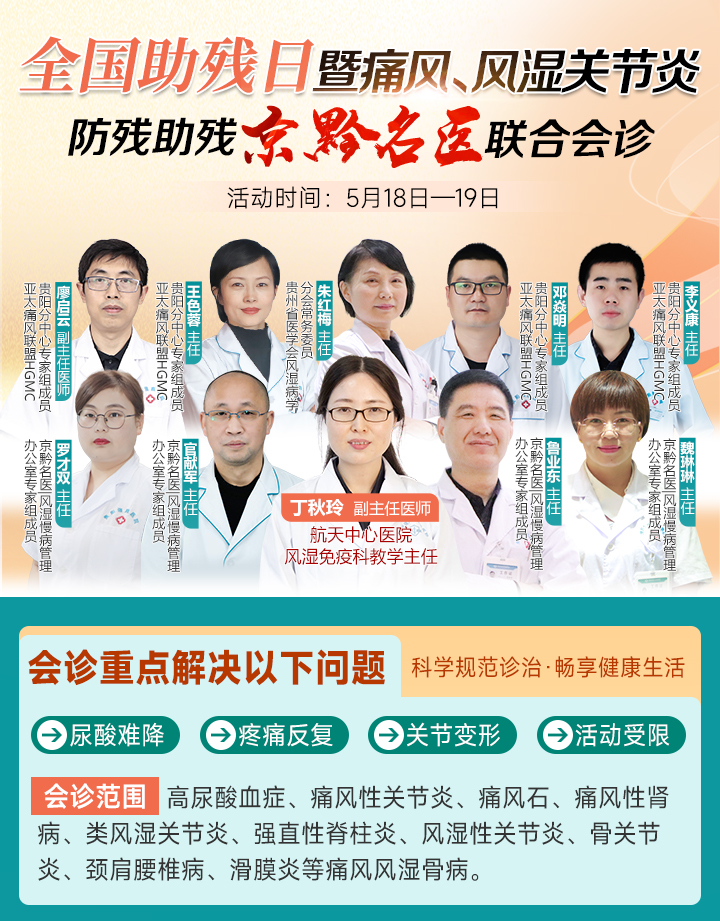 風(fēng)濕免疫病的致殘率令人心驚,而早期診斷、規(guī)范治療是阻斷或延緩關(guān)節(jié)結(jié)構(gòu)破壞、阻止關(guān)節(jié)發(fā)生畸形與殘疾、改善預(yù)后的根本措施。今年是實(shí)施“十四五”規(guī)劃的關(guān)鍵一年,也是貫徹落實(shí)殘聯(lián)八代會精神的開局之年,對此我院主動 承擔(dān)社會責(zé)任,特面向全省及周邊地區(qū)啟動“痛風(fēng)、風(fēng)濕關(guān)節(jié)炎防殘助殘京黔名醫(yī)聯(lián)合會診”活動。