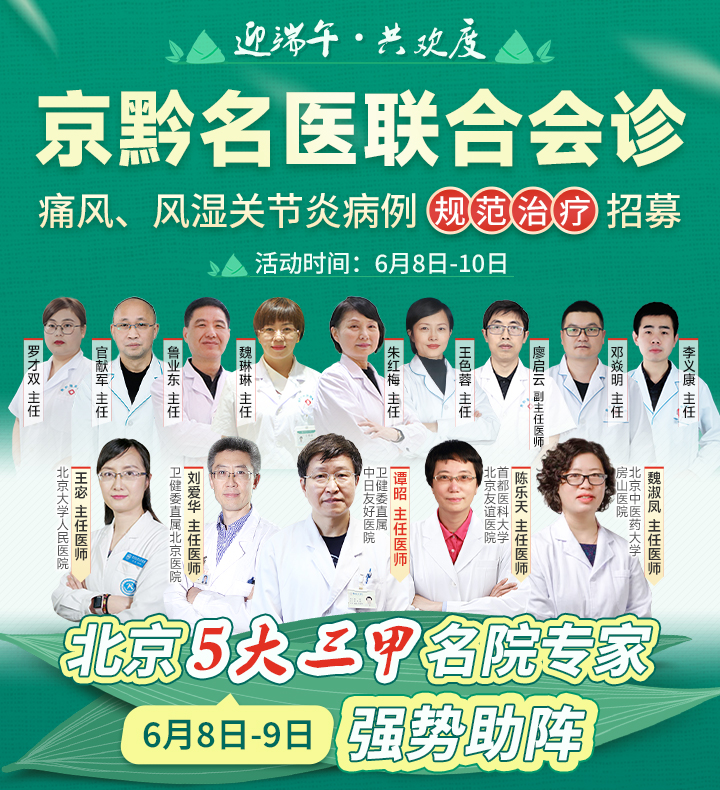 端午佳節(jié)時值夏季,正是痛風和風濕骨病的高發(fā)季節(jié)。從近期臨床接診情況來看,很多患者的關(guān)節(jié)疼痛問題也越發(fā)凸顯。為幫助廣大患者擺脫關(guān)節(jié)疼痛反復發(fā)作病情難控等困擾,6月8日-10日,我院重磅啟動“迎端午·共歡度|京黔名醫(yī)聯(lián)合會診痛風、風濕關(guān)節(jié)炎病例規(guī)范治療招募”活動。
