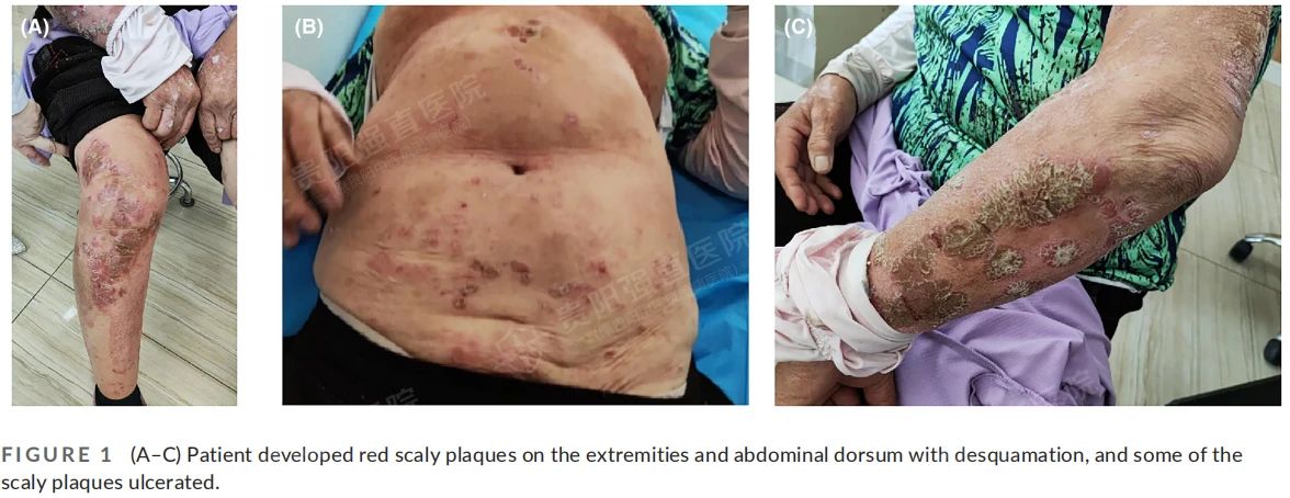 通過美國風濕病學會(ACR)和歐洲抗風濕病聯(lián)盟(EULAR)在2010年建立的診斷標準,我院一名71歲的老年女性患者被診斷為PsA合并RA。自述7年前無明顯誘因出現(xiàn)雙膝關節(jié)疼痛,但未規(guī)范治療,此后,雙膝疼痛反反復復。1年前左手、左上肢出現(xiàn)邊界清楚的紅色鱗屑斑塊,口服銀屑顆??刂疲Ч患?,四肢及腹背逐漸出現(xiàn)紅色鱗屑斑塊,就診1周前周身皮損癥狀加重,且紅色鱗屑斑塊明顯伴隨脫屑,部分鱗屑斑塊潰爛,后逐漸雙膝關節(jié)疼痛加重,活動受限,下蹲困難。2023年6月14日,我院門診以“PsA”收入院。實驗室檢查結果如下:RF:35.4 IU/ml;CRP:86.1 mg/L;ESR:6.8mm/h C4:1.3g/L;AST:36U/L;LDH: 271U/L,其余未見異常。根據(jù)臨床和實驗室結果,患者被診斷為PsA合并RA。