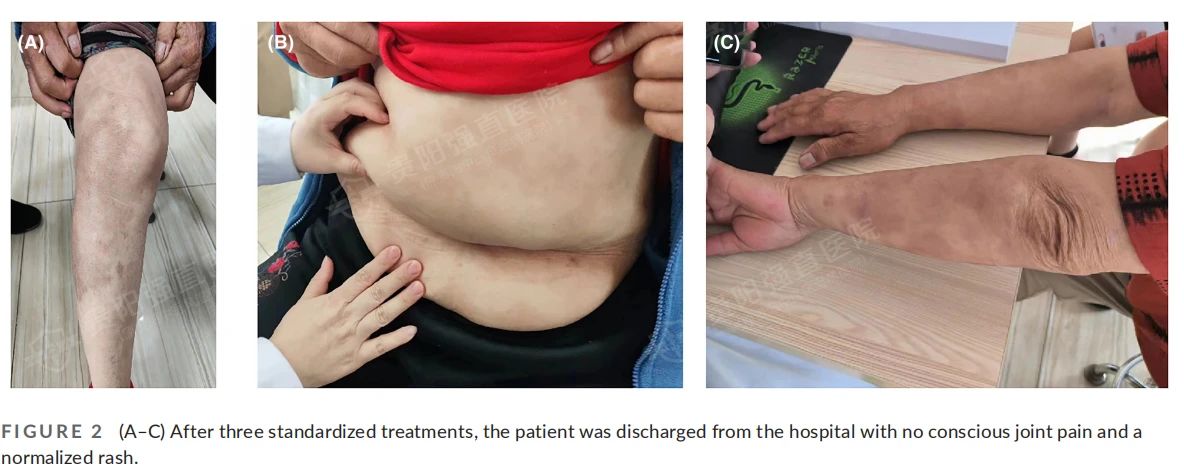 2023年6月16日起,患者接受我院規(guī)范化治療。即接受三個周期的免疫吸附治療和口服抗風濕藥物。三個治療周期后,患者自覺雙膝關節(jié)疼痛癥狀明顯緩解,皮疹開始消退,出院復查炎性指標恢復正常。
